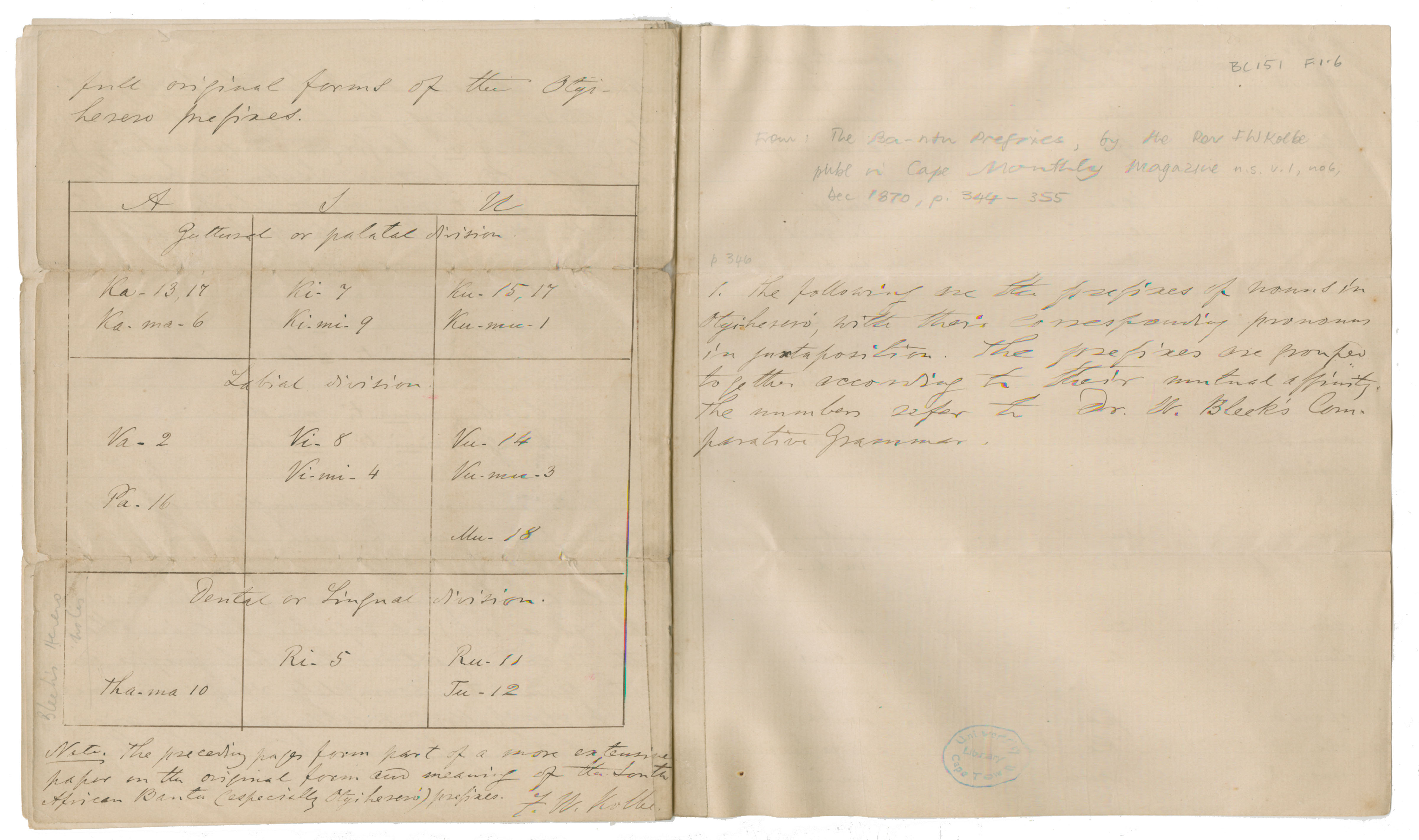 Pages from Kolbe's more extensive paper on the South African Bantu prefixes, published in 'Cape Monthly Magazine', Volume 1 (6), December 1870 (p.344-355), MS.
