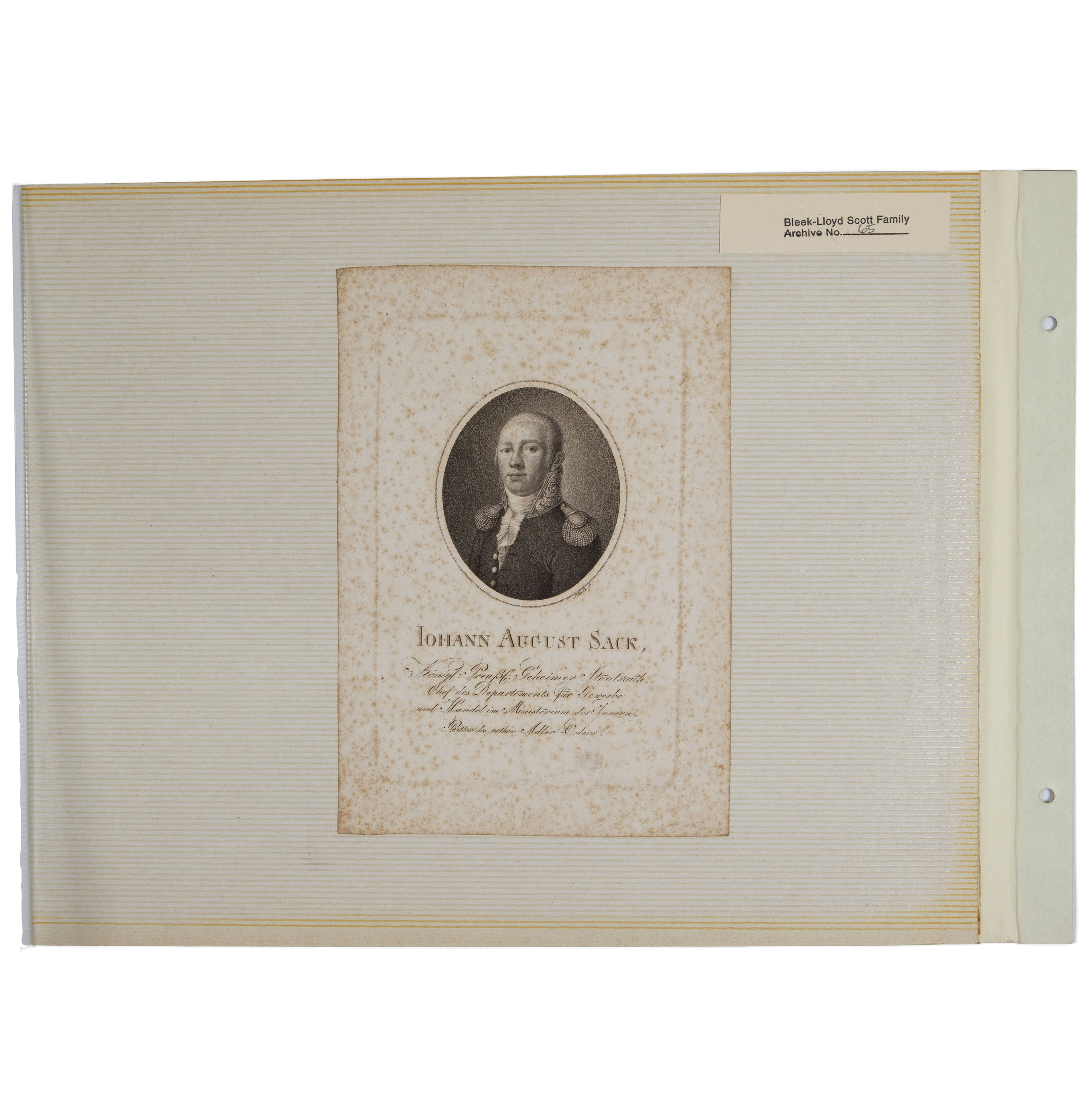 Text engraved below gives Sack's name and some career details in German. He was a Privy Councilor at the Prussian Court, Chief of the Department of Industry and Commerce in the Ministry of the Interior, and a Knight of the Order of the Red Eagle. It has not yet been established exactly how he was related to Carl August Sack. The print artist was J.S.L. Halle, an 18th century engraver. The signature on this Sack engraving is identical to one on an engraving of mathematician and physicist Johann Daniel Titius (1729-1796) and the capitalization and script of the inscription below the Sack portrait are the same as Halle used on the Titius engraving.