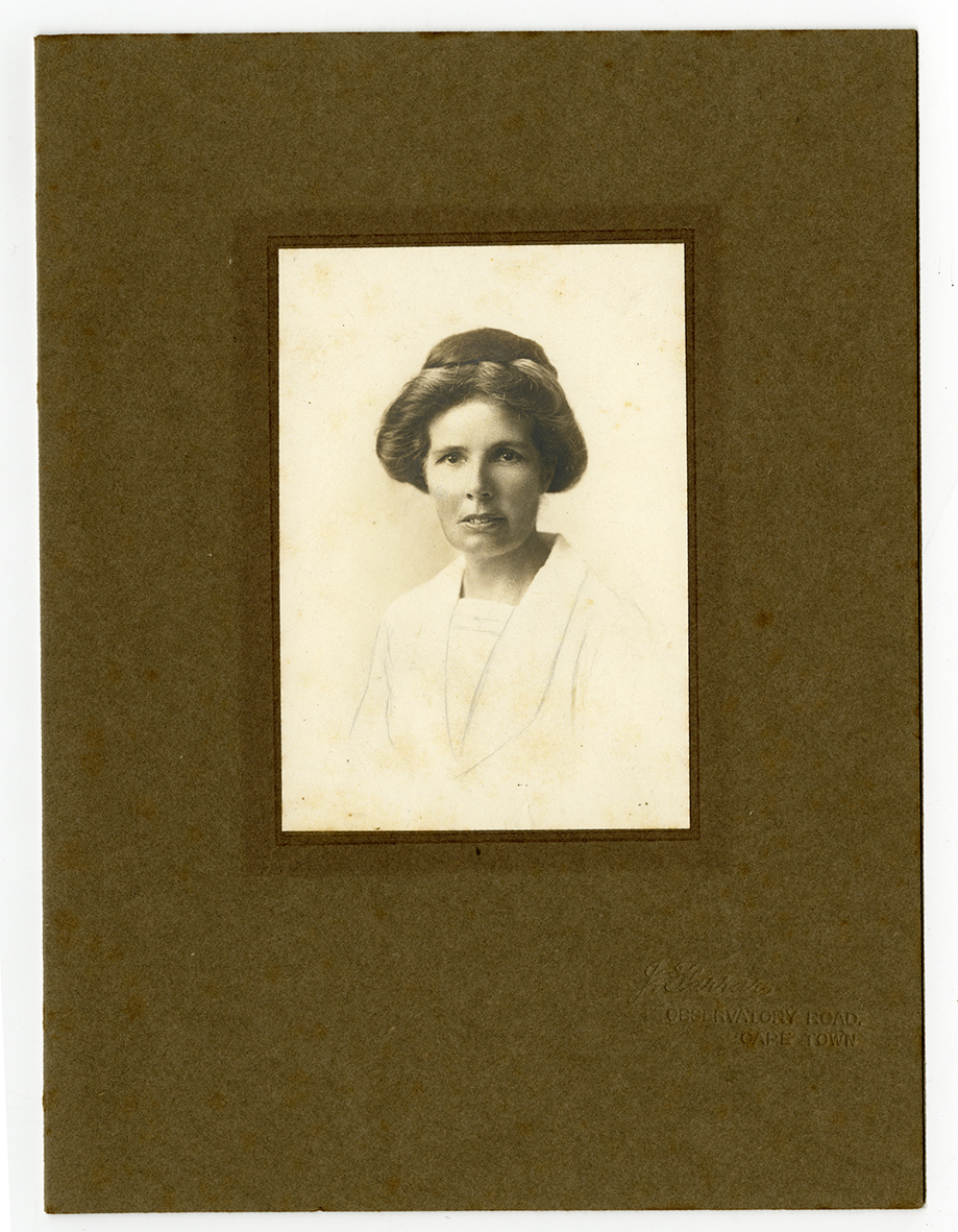 Studio portrait. Sepia. Photographer: J. Farrar, Observatory Road, Cape Town. 4 x 2¾ inches mounted in brown card photographer's folder, 8 x 6 inches.