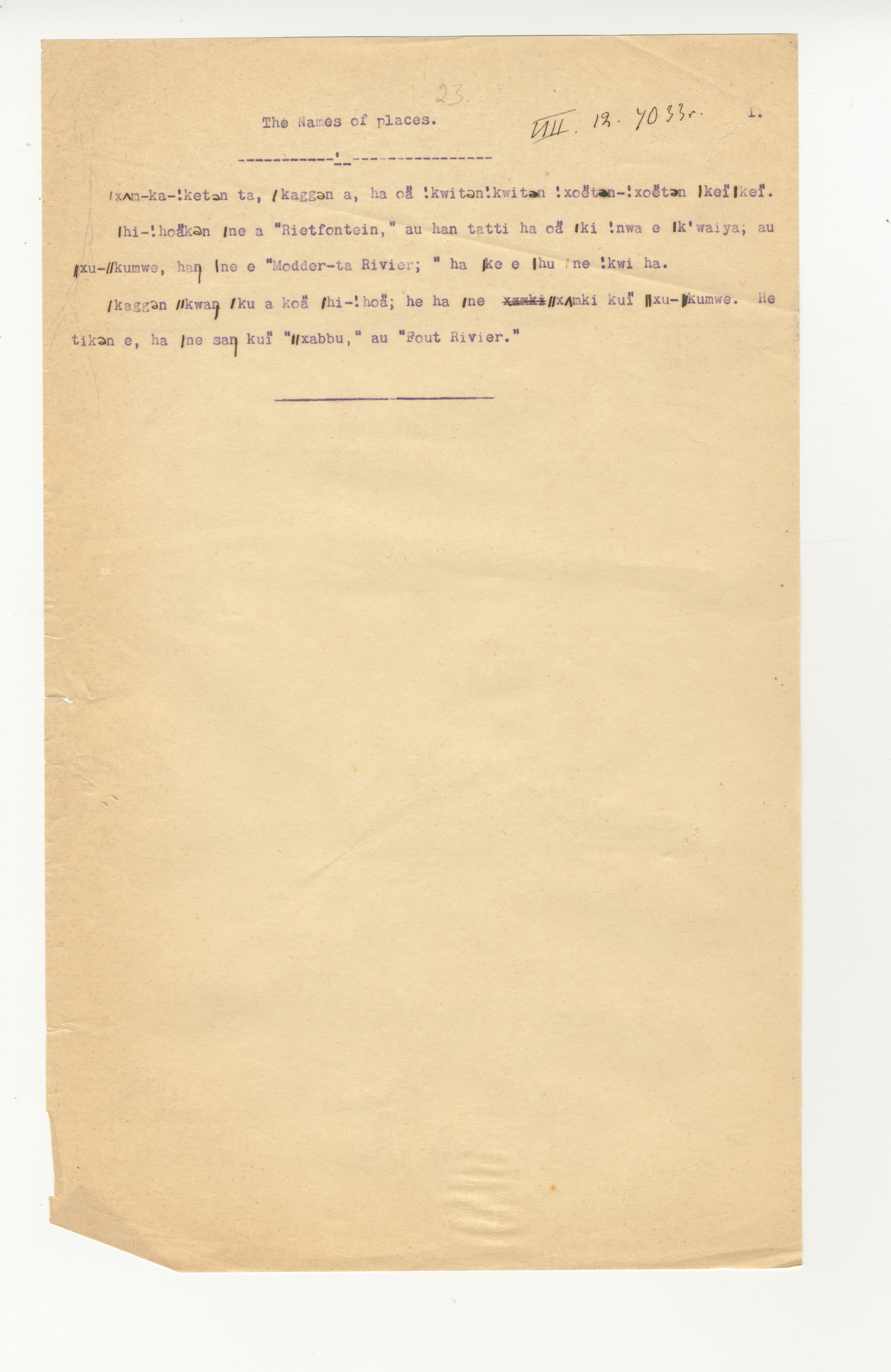 Manuscript page taken from |han≠kass'o's story, The Mantis -- giver of names to places -- in Lloyd notebook 12 (dated 1878), page 7033 rev. (as given by DF Bleek [however, the text matches page 7033 rev., and finishes on 7034 rev.]).