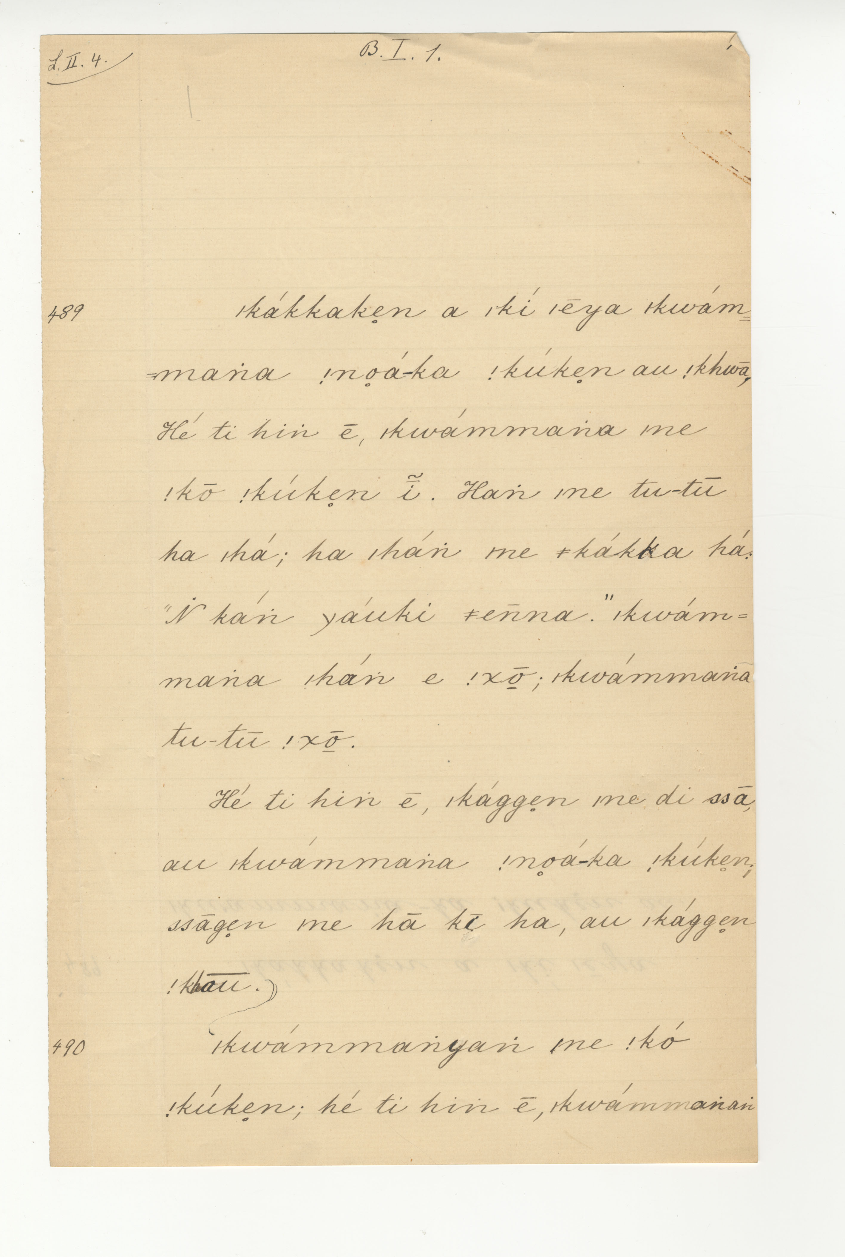 Manuscript page taken from ǁkabbo's story, The |kaggen who took |kammanga's shoe, and turned it into an eland -- in Lloyd notebook 4 (dated 1871), pages 489 to 490.