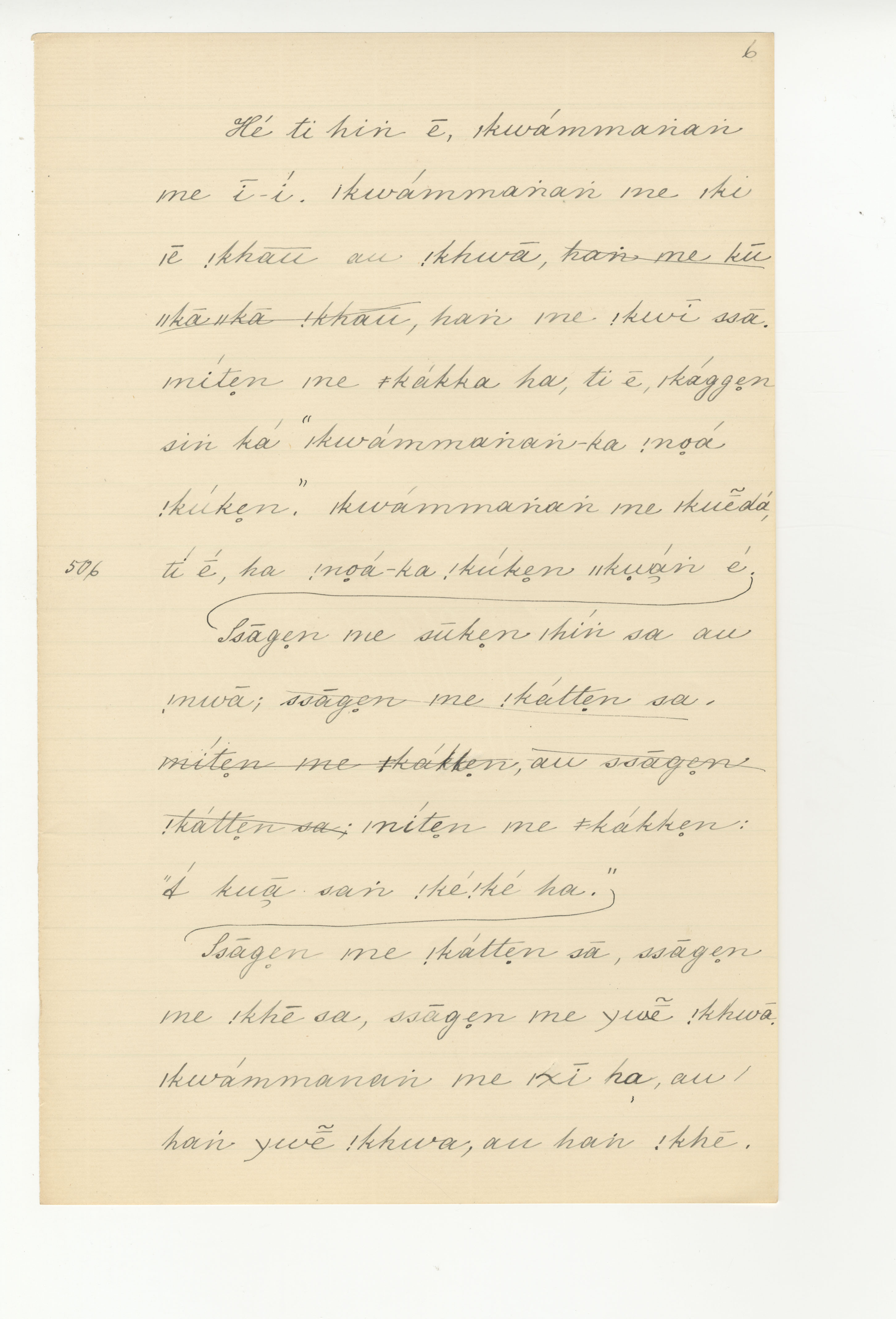 Manuscript page taken from ǁkabbo's story, The |kaggen who took |kammanga's shoe, and turned it into an eland -- in Lloyd notebook 4 (dated 1871), pages (continuing from) 505 to 506.