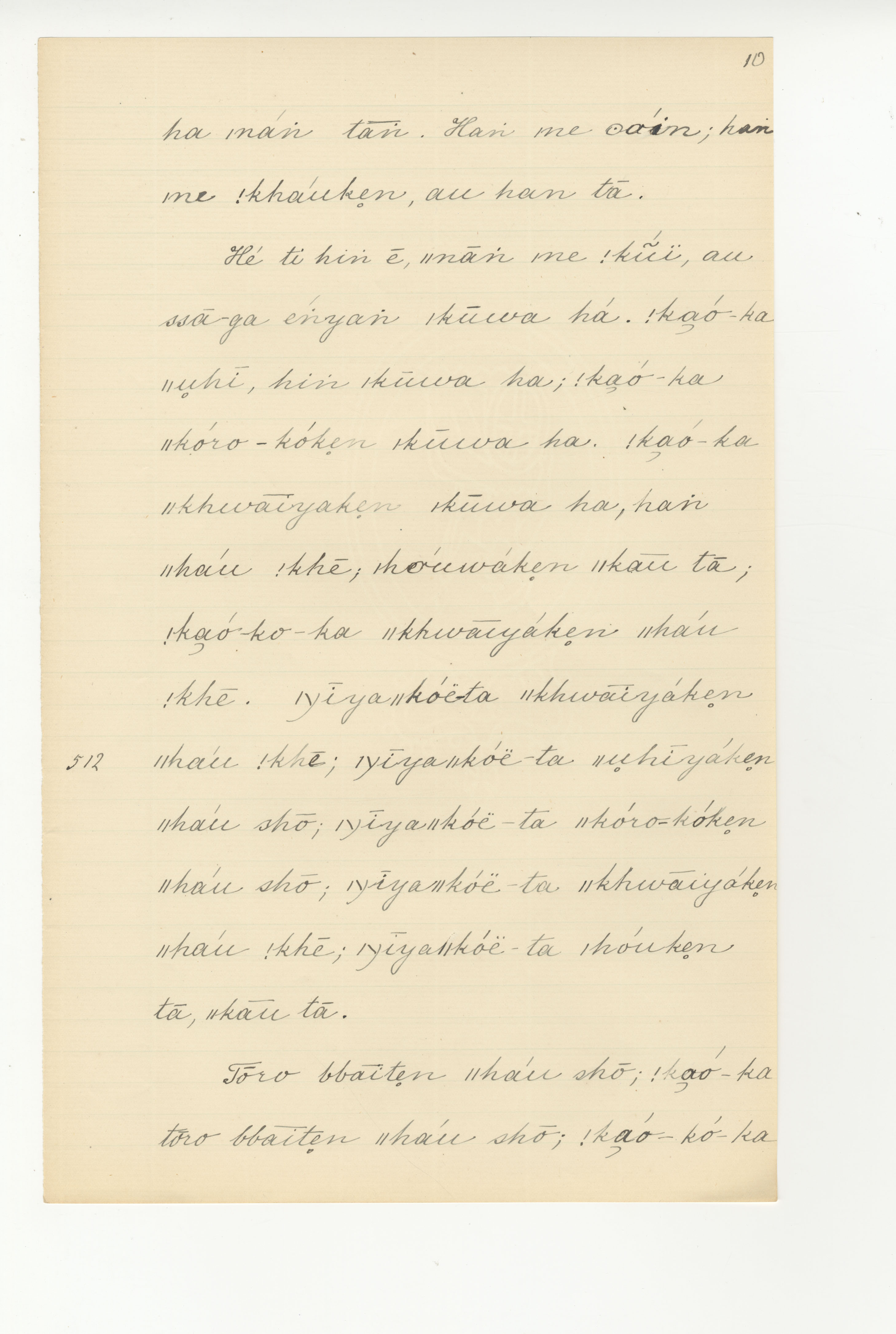 Manuscript page taken from ǁkabbo's story, The |kaggen who took |kammanga's shoe, and turned it into an eland -- in Lloyd notebook 4 (dated 1871), pages (continuing from) 511 to 512.