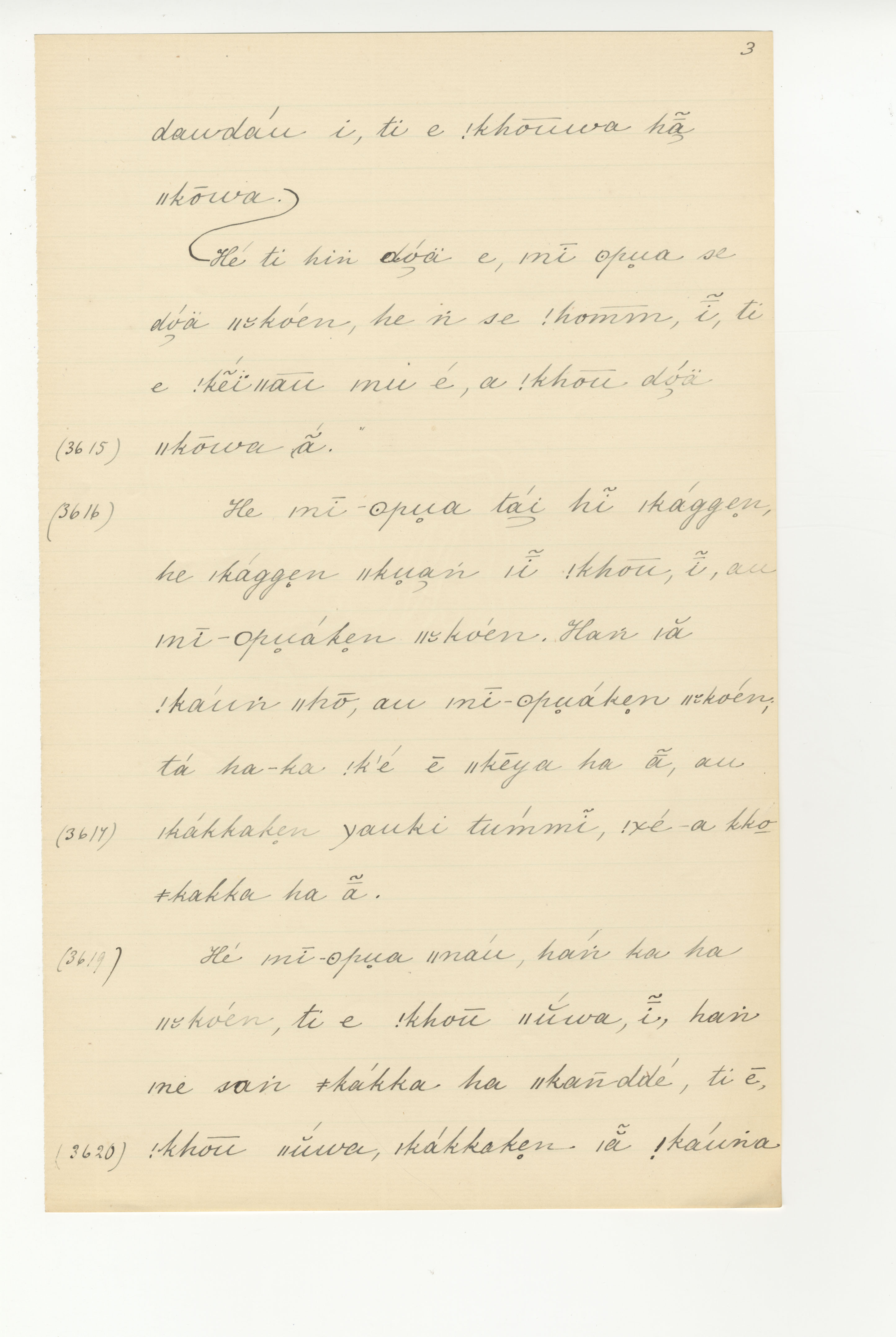 Manuscript page taken from Dia!kwain's story, How the Ichneumon discovered what the Mantis did with his honey -- in Lloyd notebook 4 (dated 1873 to 1874), pages (continuing from) 3614 to 3620.