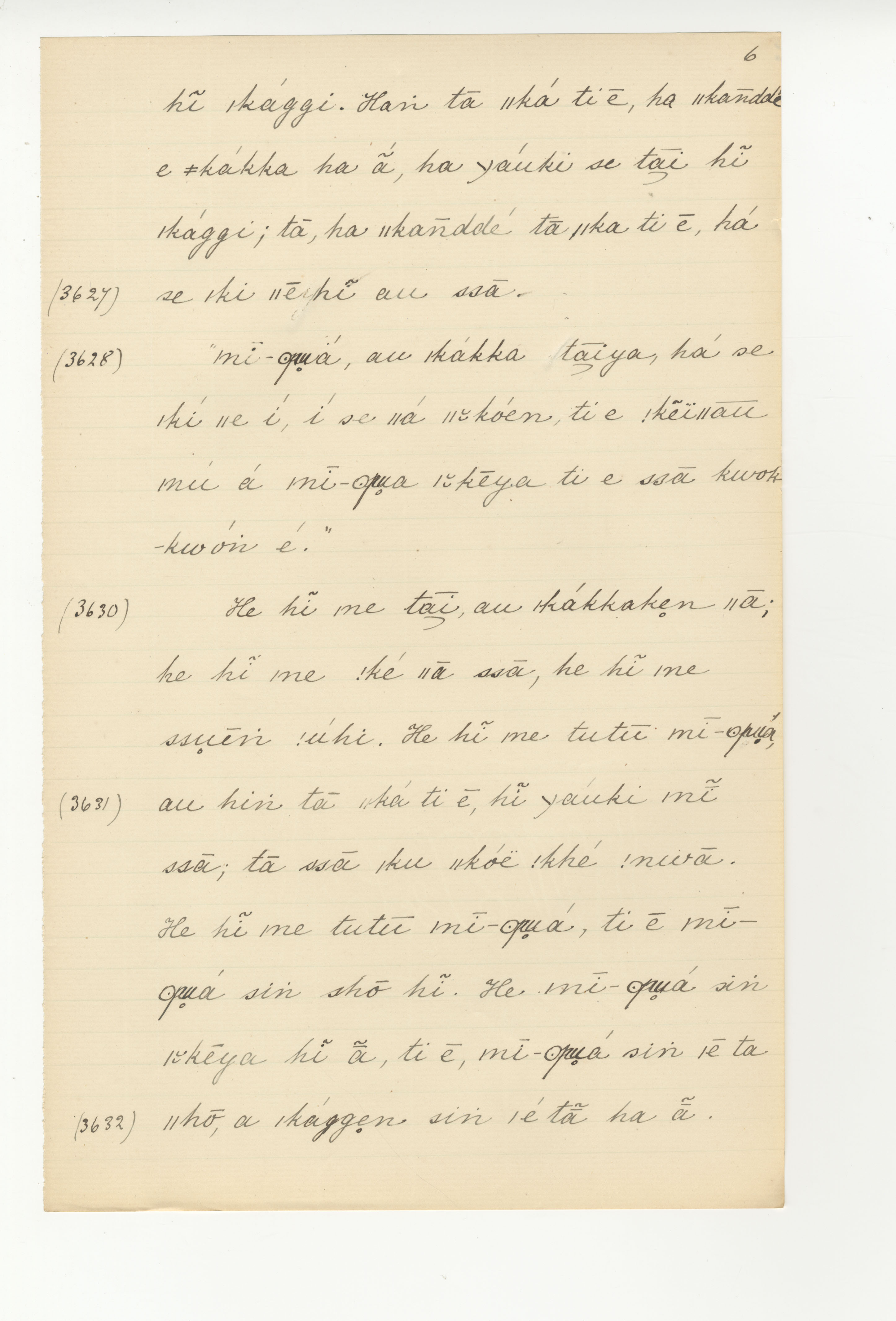 Manuscript page taken from Dia!kwain's story, How the Ichneumon discovered what the Mantis did with his honey -- in Lloyd notebook 4 (dated 1873 to 1874), pages (continuing from) 3626 to 3632.
