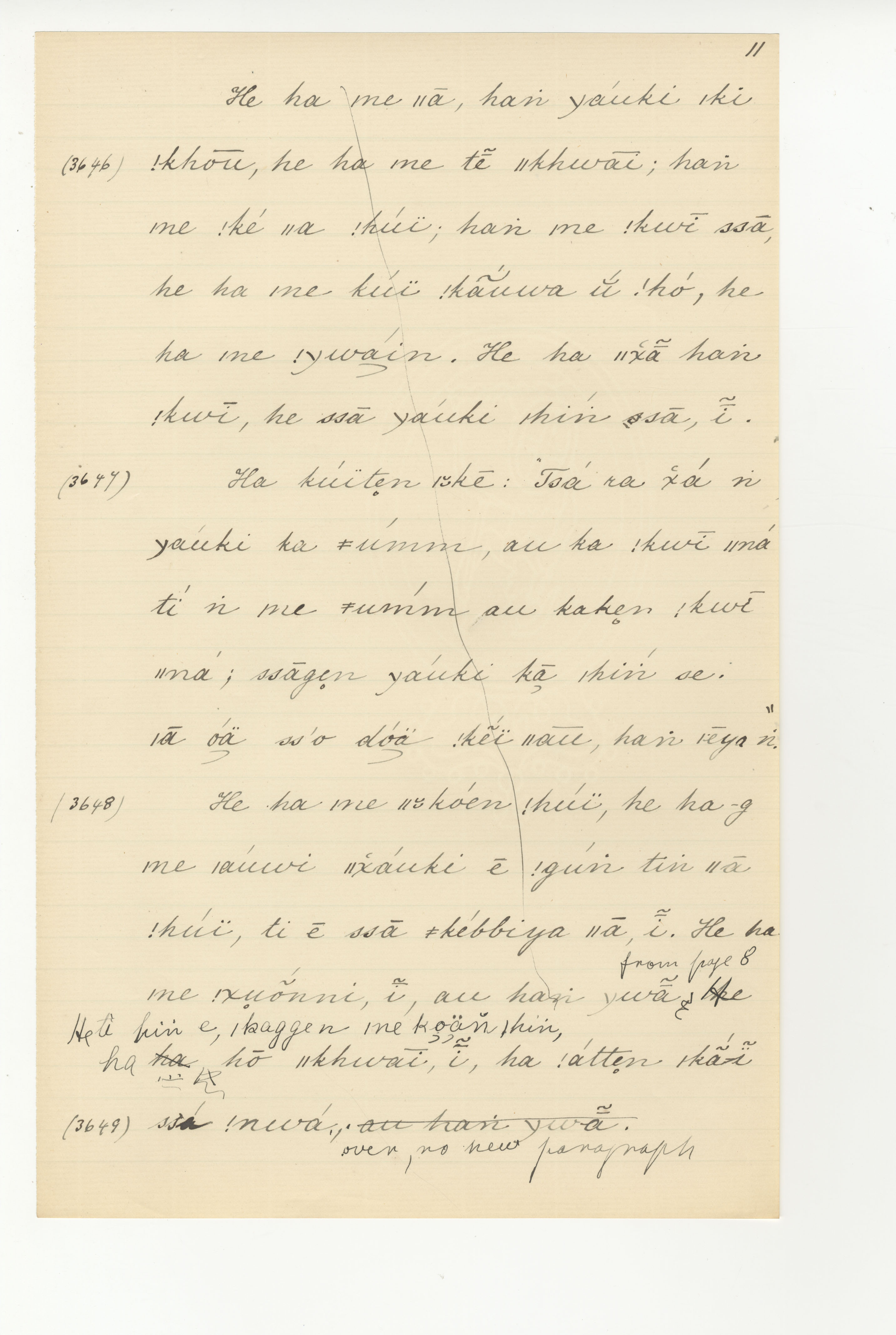 Manuscript page taken from Dia!kwain's story, How the Ichneumon discovered what the Mantis did with his honey -- in Lloyd notebook 4 (dated 1873 to 1874), pages (continuing from) 3645 to 3649 (however, 3646 and 3647 are cancelled).