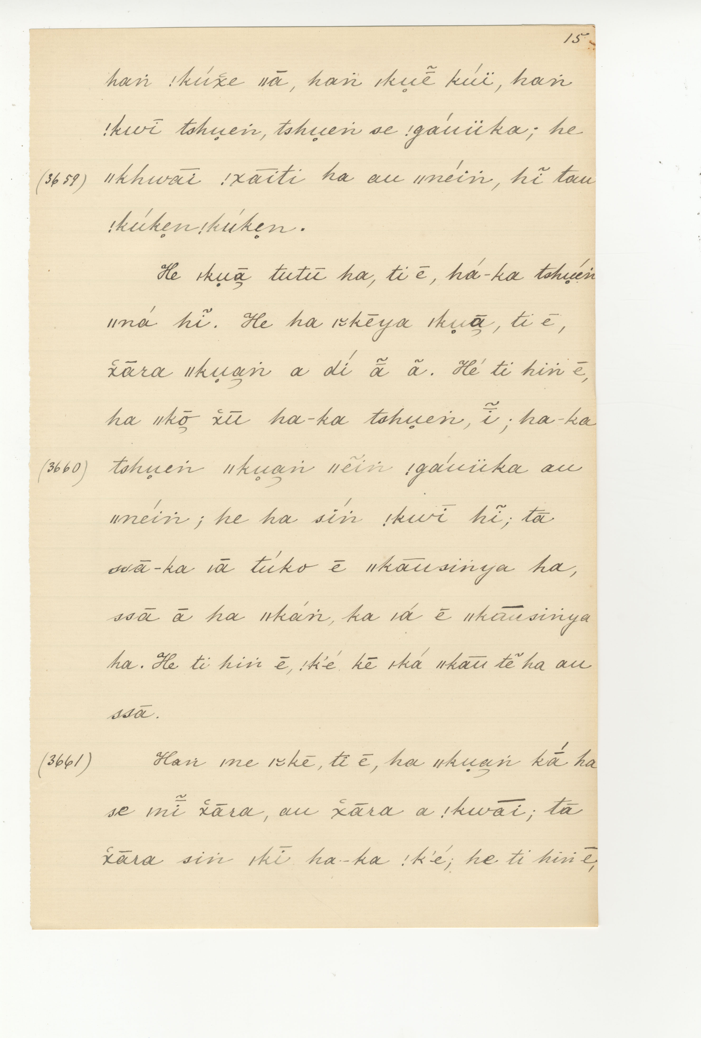 Manuscript page taken from Dia!kwain's story, How the Ichneumon discovered what the Mantis did with his honey -- in Lloyd notebook 4 (dated 1873 to 1874), pages (continuing from) 3658 to 3661.