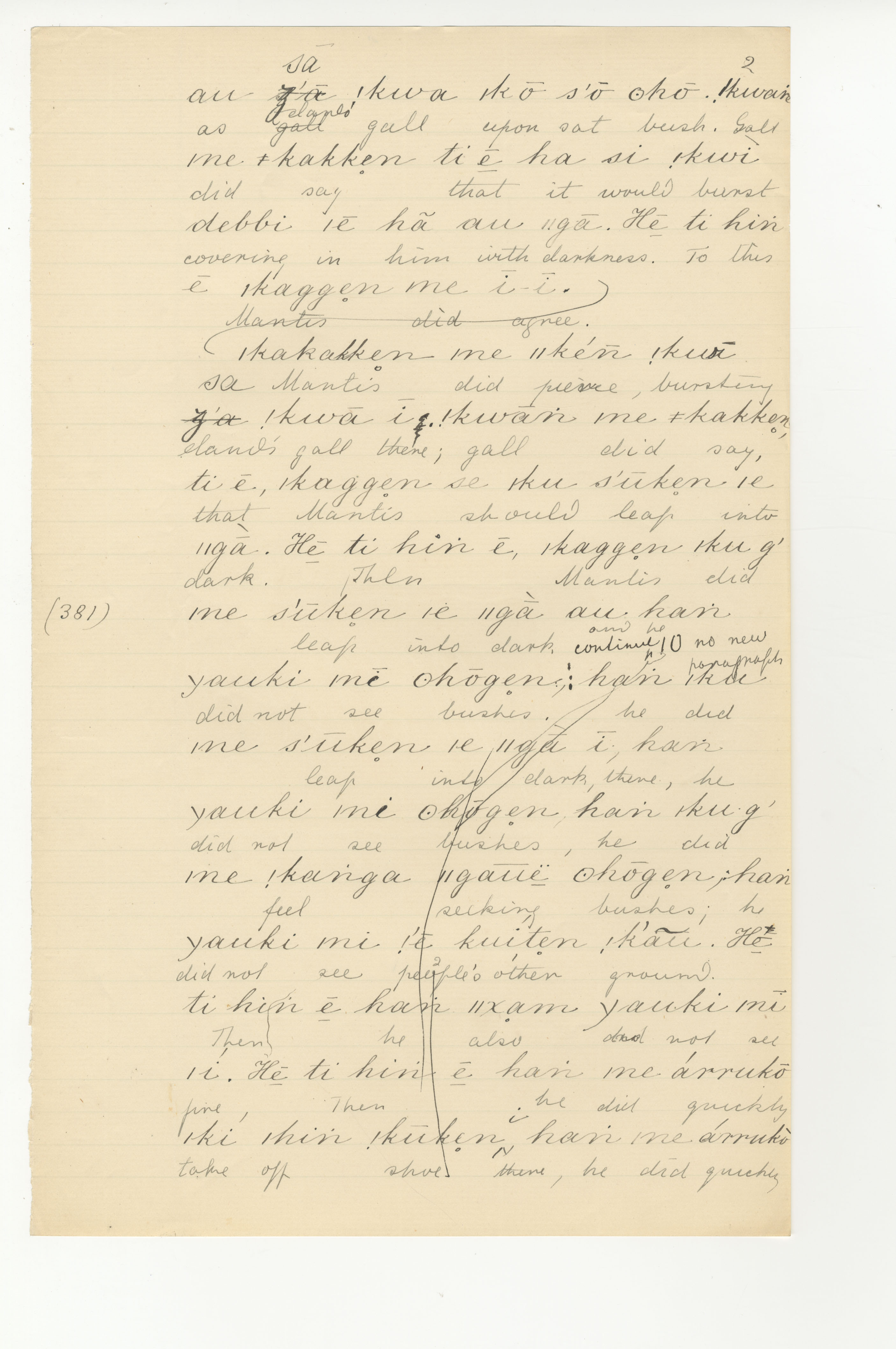 Manuscript page taken from ǁkabbo's story, |kaggen (the Mantis) and the Moon (version 1) -- in Bleek notebook 2 (dated 1871, 1872, 1873 [notes added]), pages (continuing from) 380 to 381.