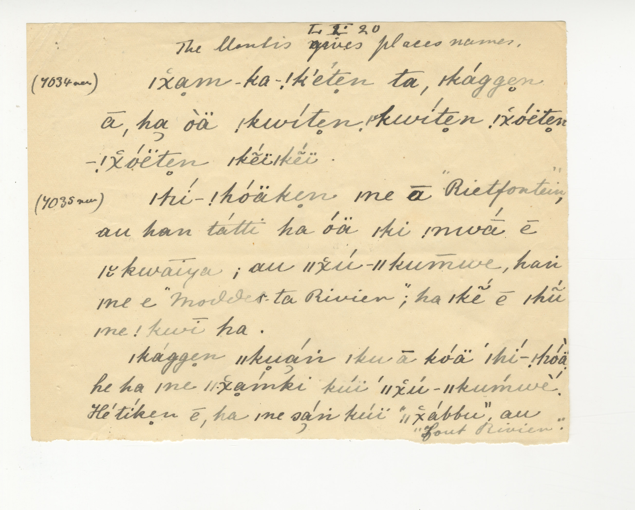 Manuscript page taken from |han≠kass'o's story, The Mantis -- giver of names to places -- in Lloyd notebook 12 (dated 1878), pages 7034 rev. to 7035 rev (as given by DF Bleek [however, the text matches pages 7033 rev. to 7034 rev.]).